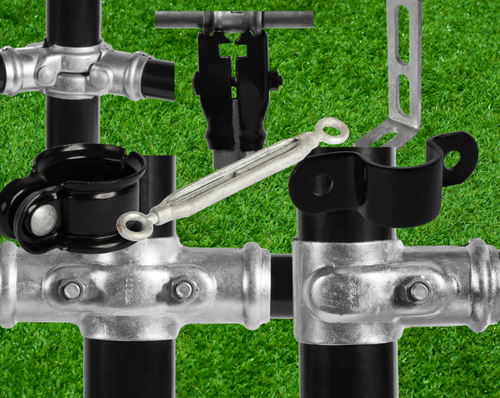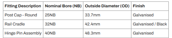 All fittings are generally supplied in a hot-dip galvanised finish. Select items may also be available in powder-coated finishes (e.g. black) for aesthetic matching.